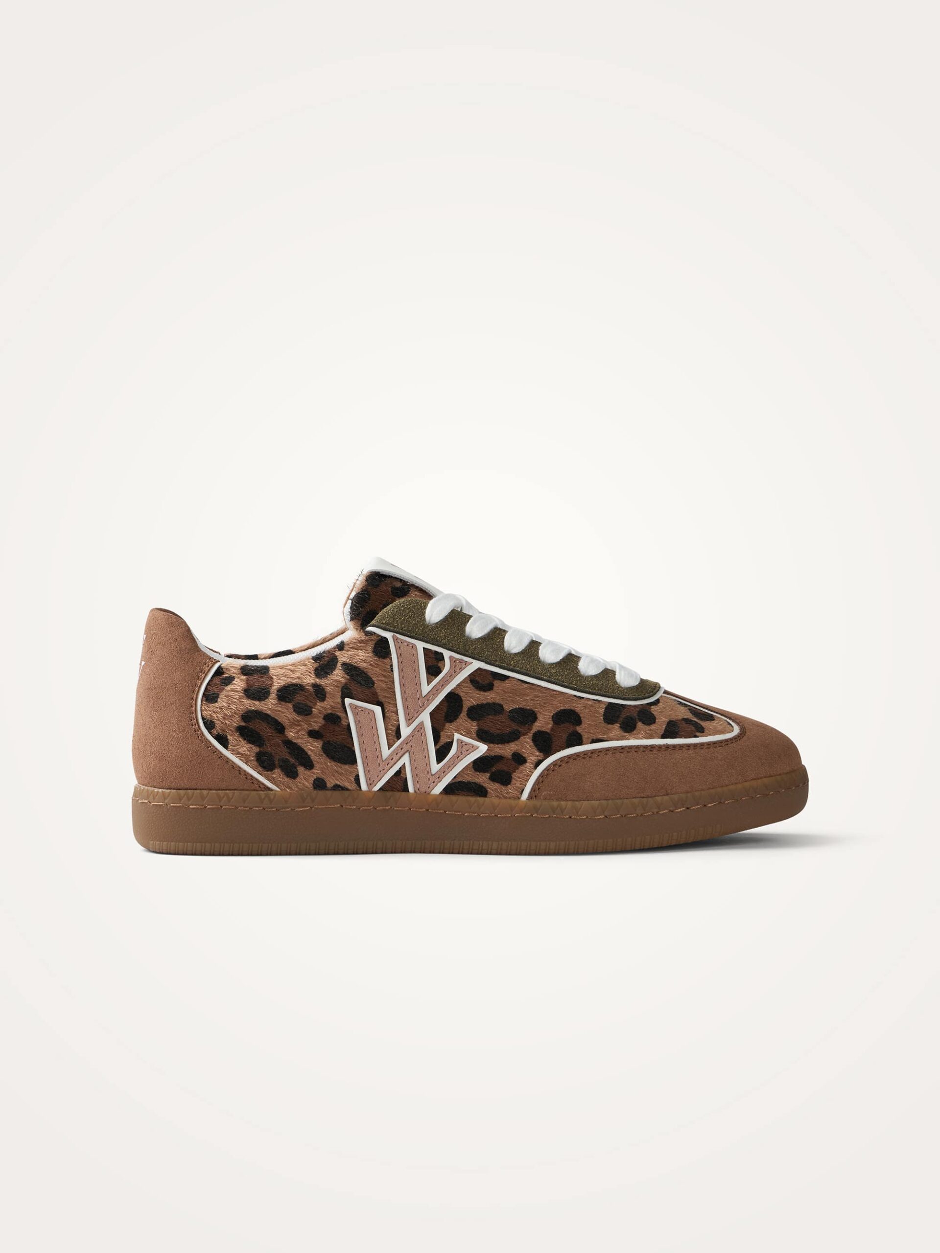 La basket SUZANNE effet poulain à imprimé léopard – monogramme en suédine effet peau de pêche vieux rose – bout avant et contrefort en suédine effet peau de pêche camel – garants en suédine effet daim fendu vert kaki – liserés en similicuir blanc – fermeture à lacets blancs – bout rond – semelle intérieure amovible à microbilles effet massant – semelle fine rétro camel cousue