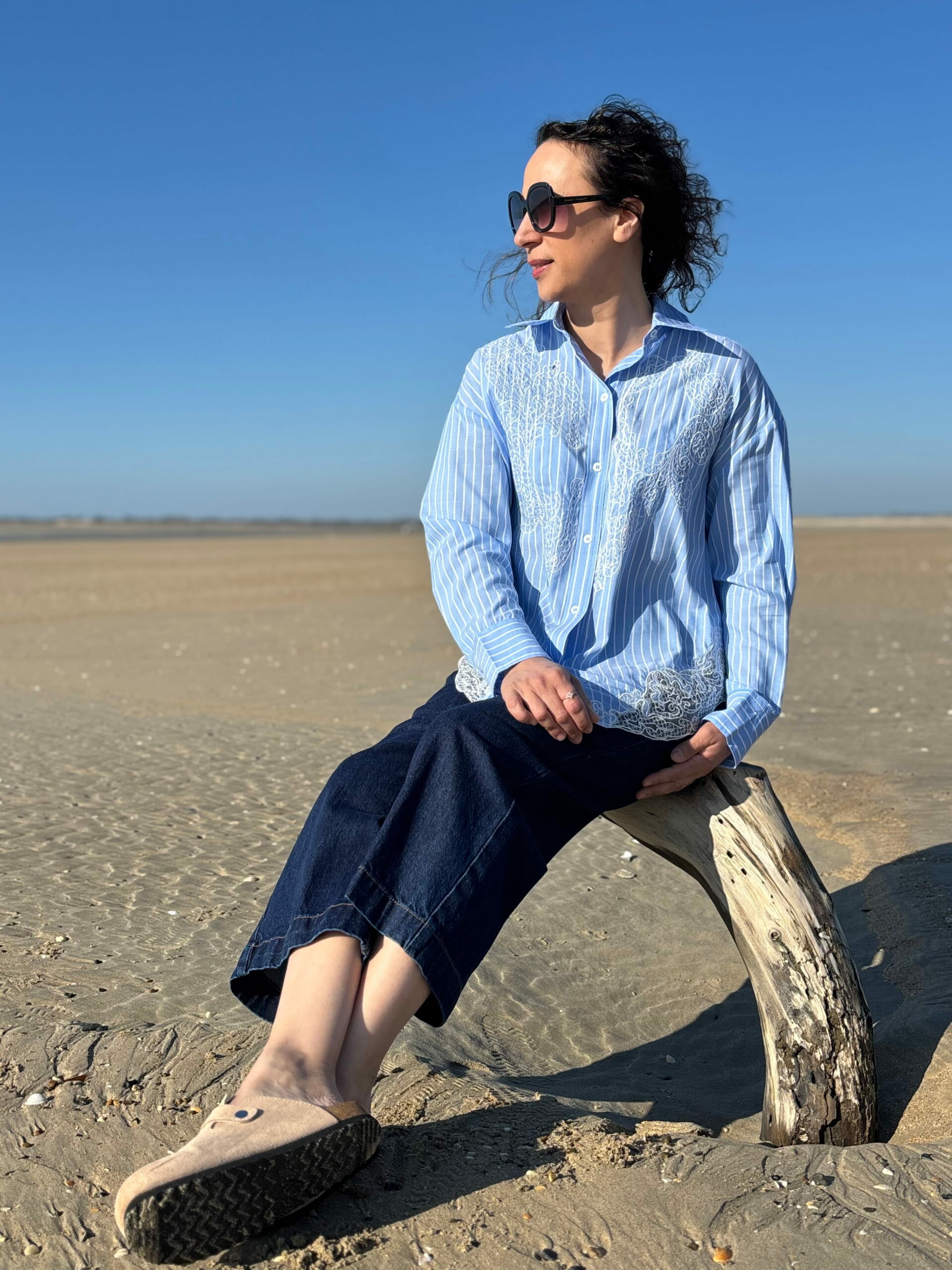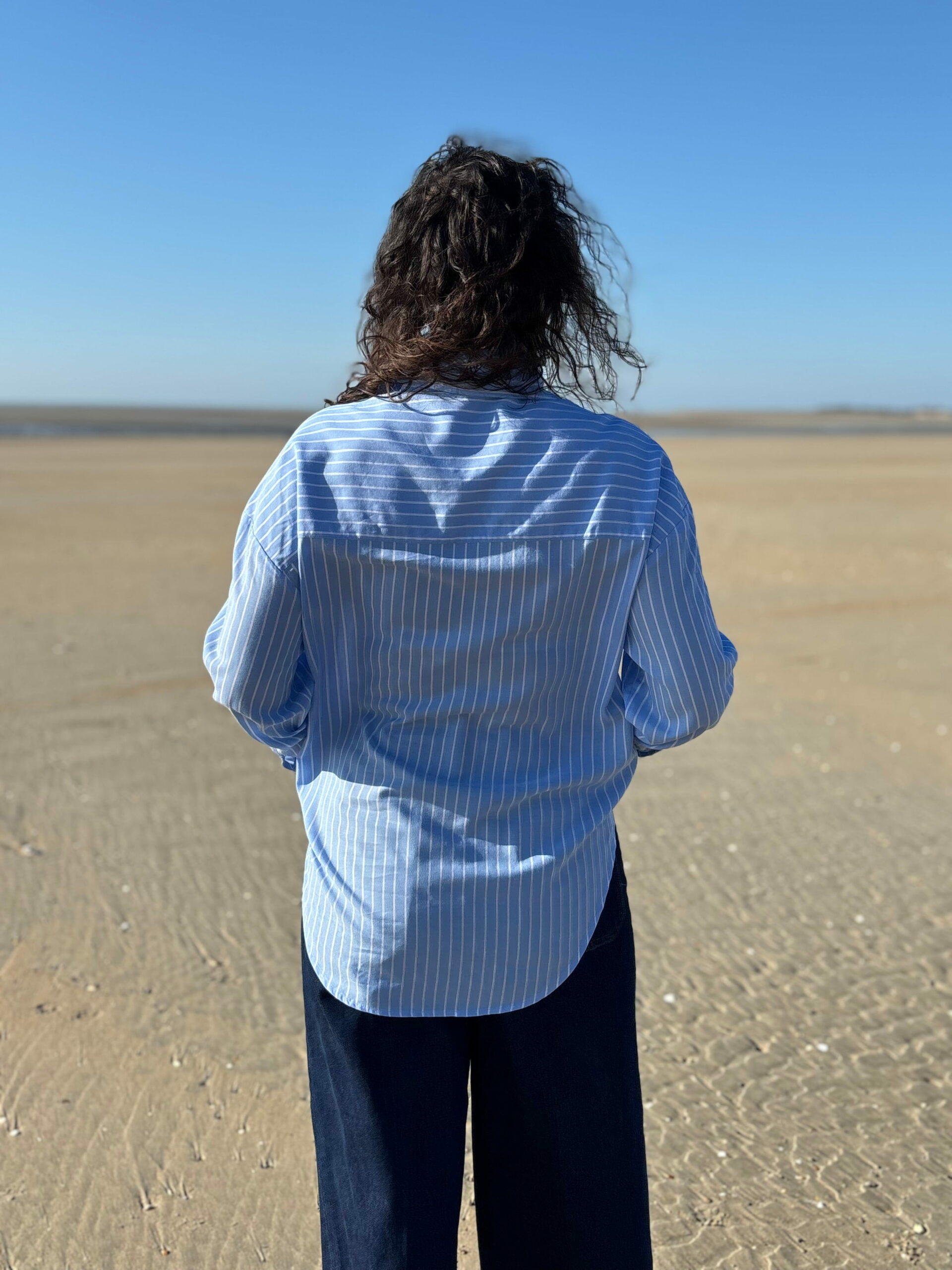 La chemise rayée coupe loose, manches longues à poignets boutonnés. Col classique et ouverture boutonnée, sublimée par de délicats détails en dentelle.