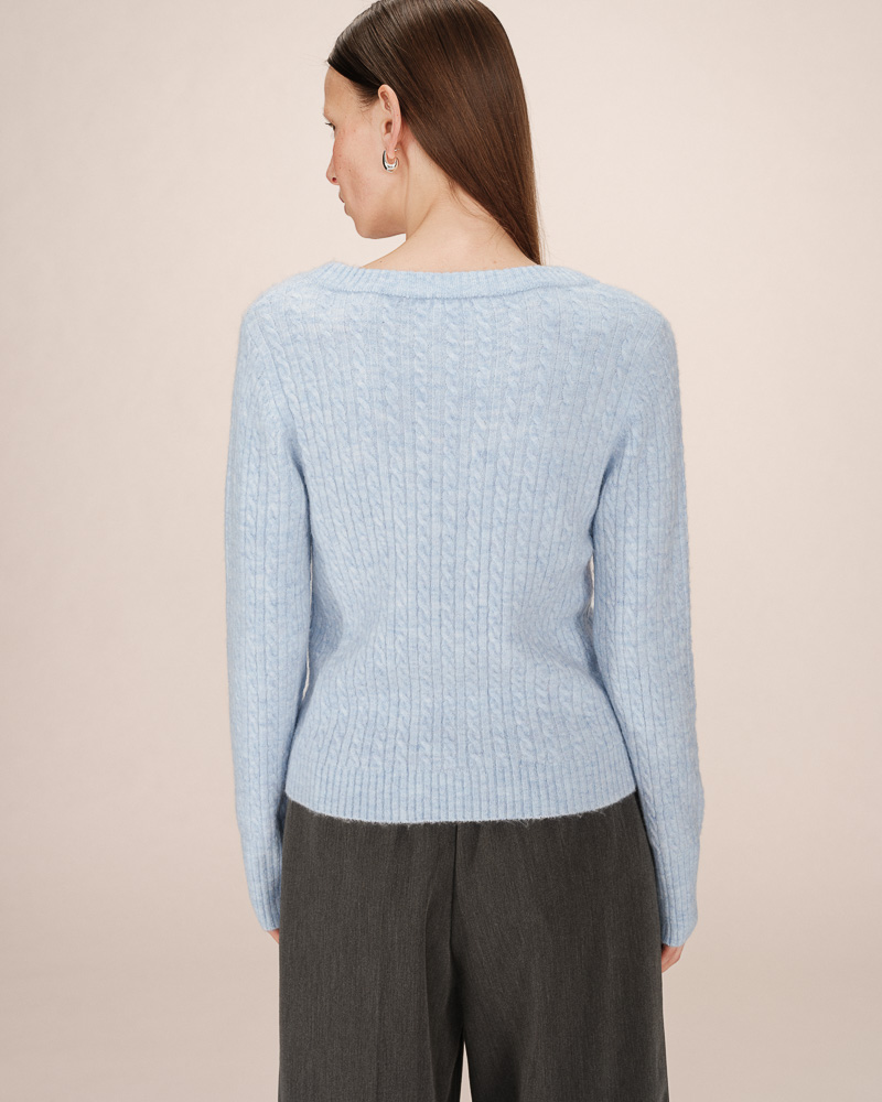 Le gilet tricoté SAMSO se distingue par sa maille torsadée délicate et sa coupe ajustée. Son col en V et ses finitions côtelées apportent une touche féminine.