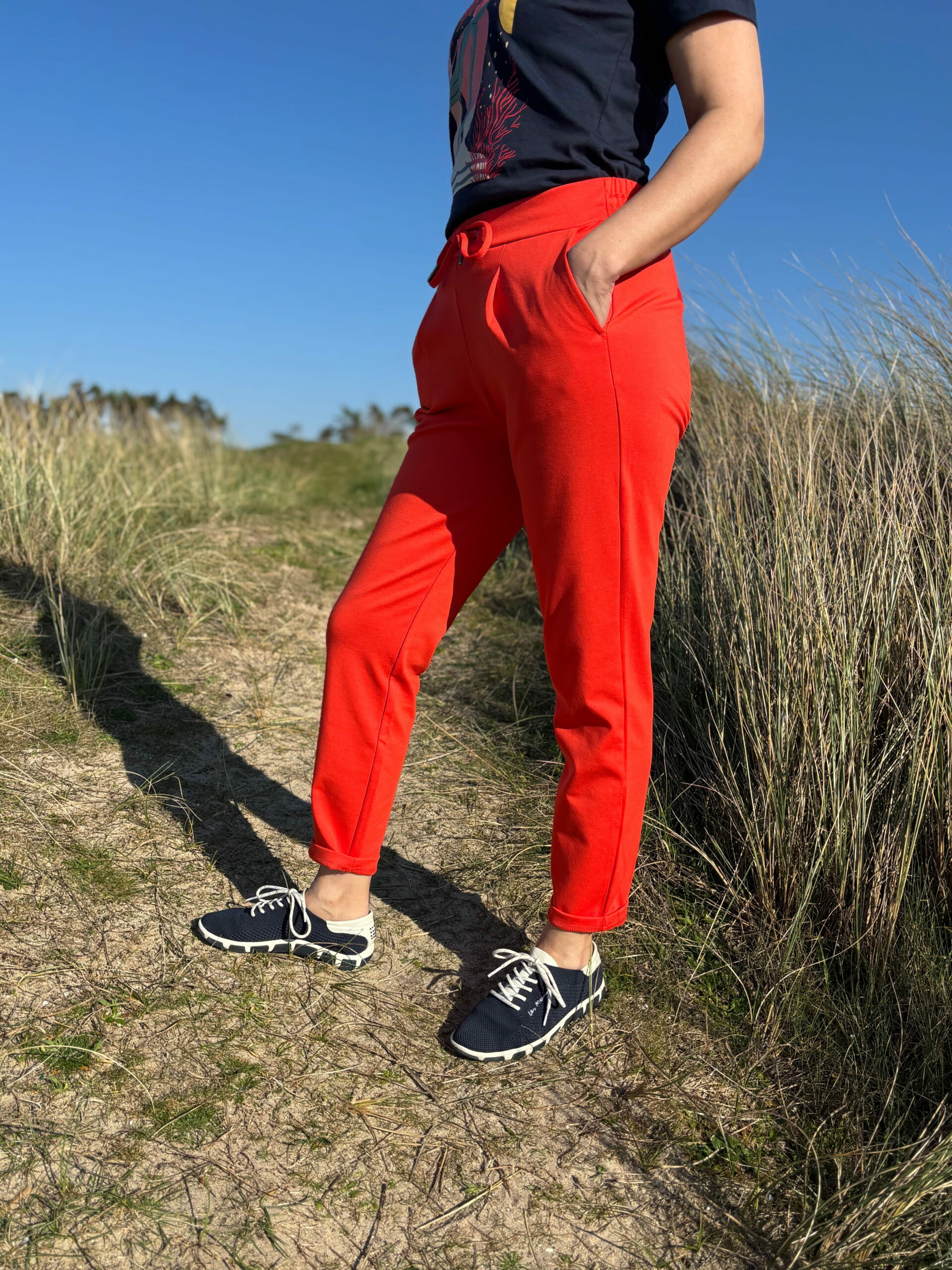Le pantalon RIZETTA fuselé présente une taille mi-haute élastiquée avec un cordon de serrage visible et des poches latérales avant.
