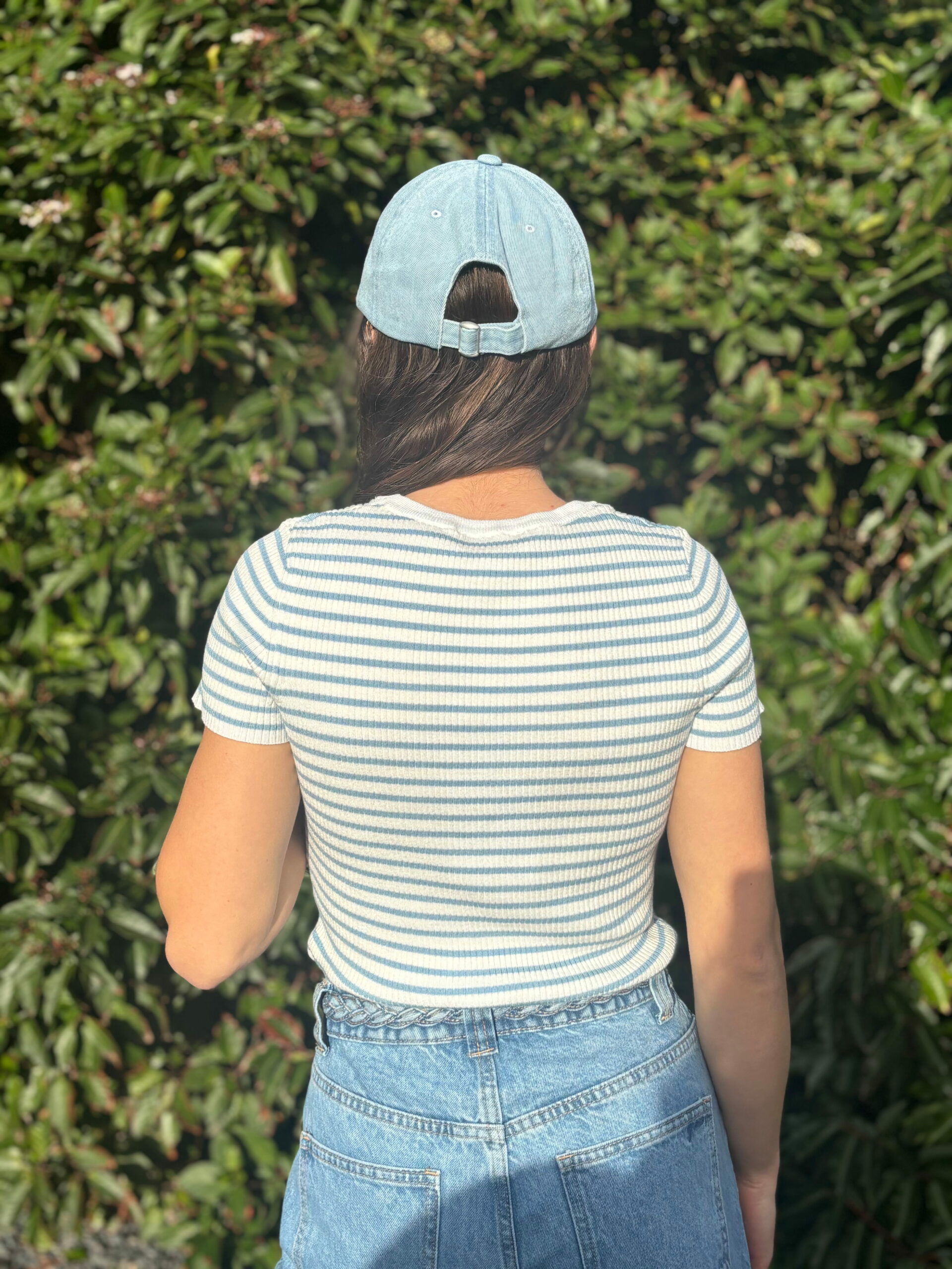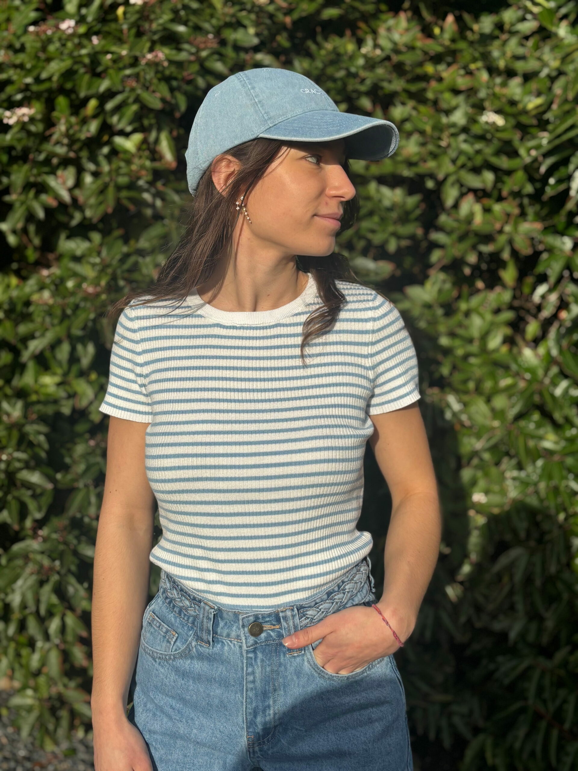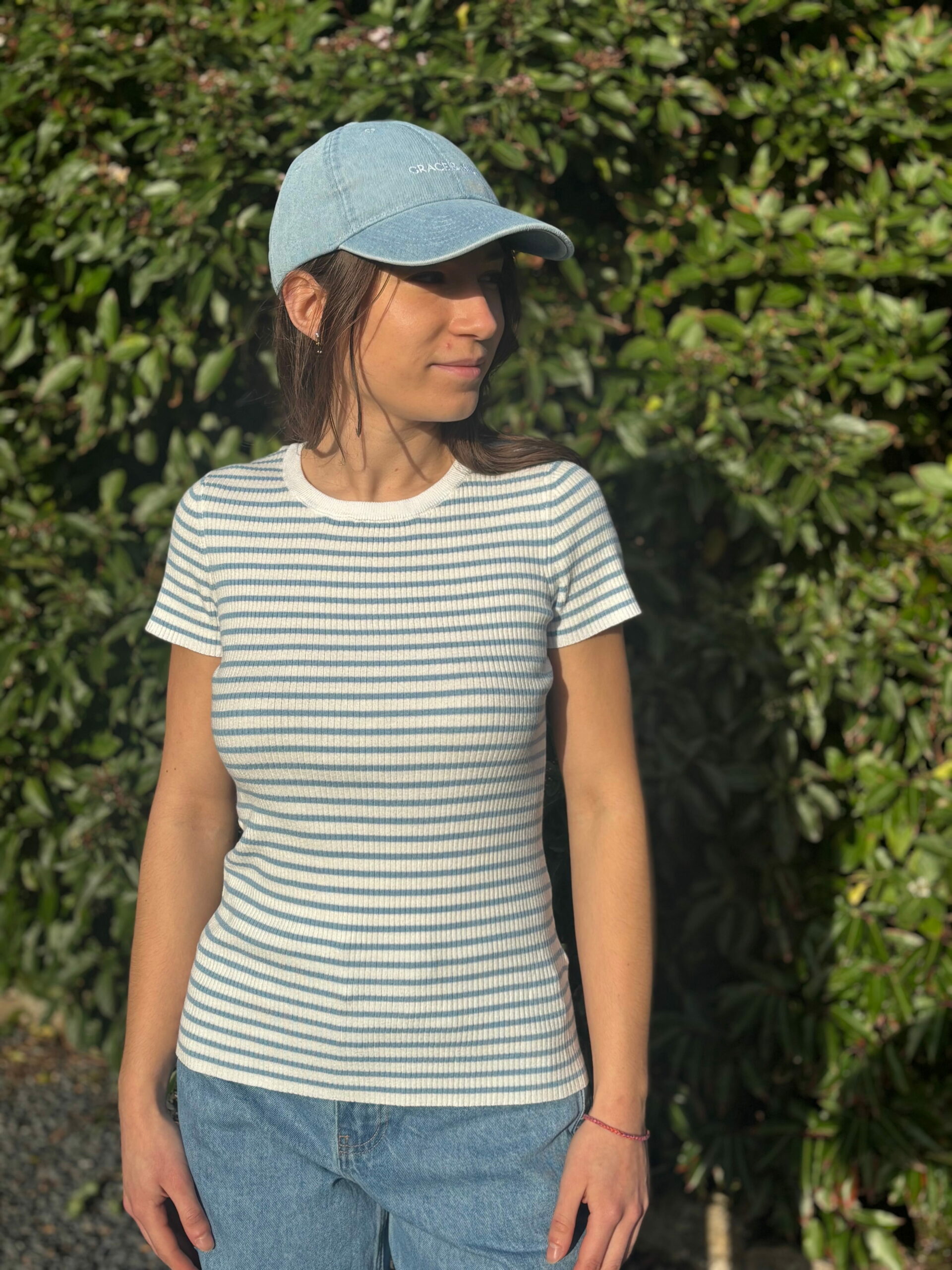 Le top rayé VENDREDI à fines côtes présente une coupe ajustée qui épouse la silhouette. Il est doté de manches courtes et d’une encolure ronde pour un style simple et féminin.